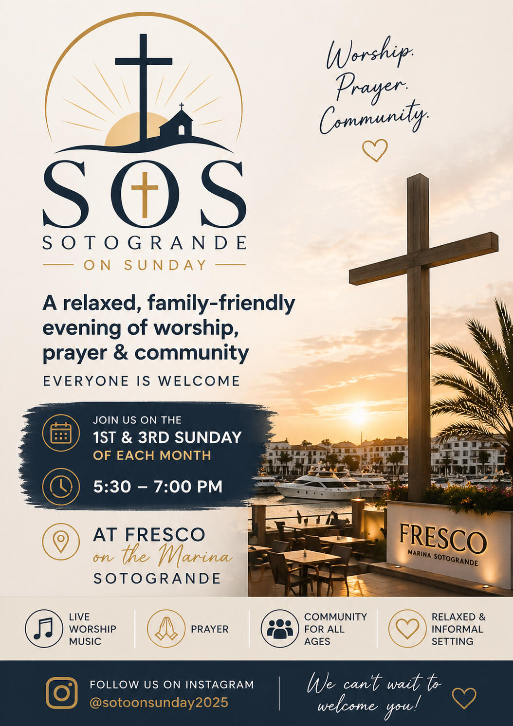 SOS Sotogrande (Sotogrande On Sunday) is a community gathering featuring music, fellowship, and gospel singing. Held on the 1st & 3rd Sunday of each month at 17:30 - 19:00.